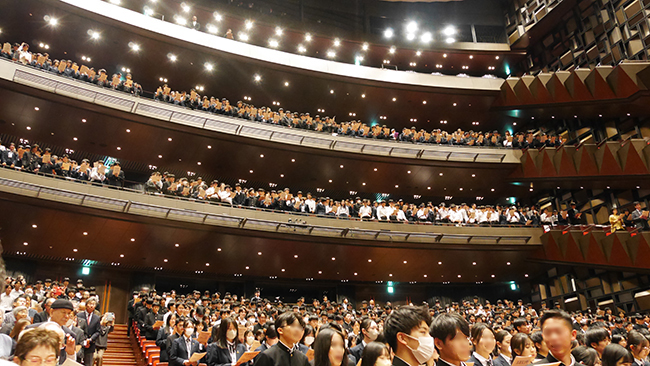 最後は生徒たちを交えた交響楽団の伴奏で校歌斉唱というぜいたくなひととき。会場を埋め尽くした生徒や同窓生全員が起立して歌う。この日は生徒957名に保護者、卒業生、職員、来賓あわせて1400名近くが出席。ホールいっぱいに歌声が響き渡り、感動のうちに式典を終えた。