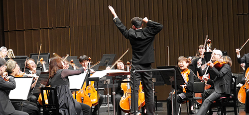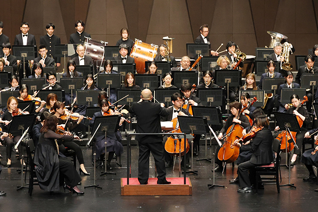 続いて、弦楽合奏団、吹奏楽部の生徒たちも楽団員に混じってエルガー「威風堂々」を演奏。堂々とした演奏に大きな拍手が起こった。
