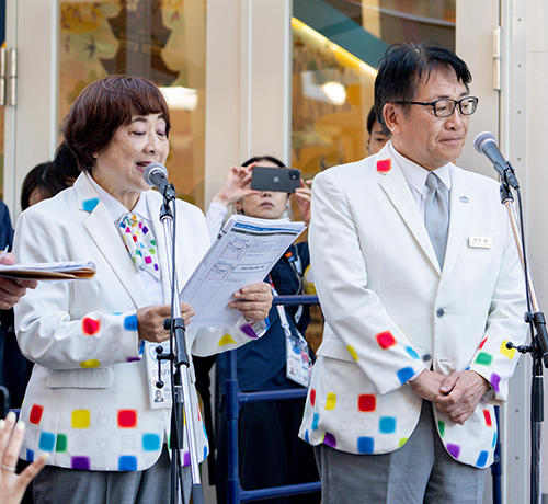 入館者148万人達成を祝う式典で司会をする坂口さん(左)。右は関西パビリオン館長を務めた森健夫さん。
