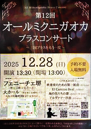 母校吹奏楽部OB・OG会と現役生部員たちが一体となって演奏する「オールミクニガオカブラスコンサート」が来たる12月28日、「三国ブラスをもう一度」と銘打ってフェニーチェ堺で開催されます。今回は第12回、4年ぶりの開催です。ぜひご来場を。